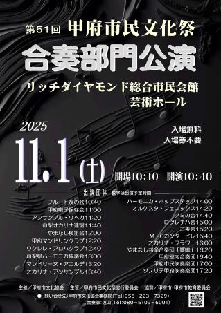昭和61年に定期演奏会を実施、平成5年の第3回定演以降は1〜2年に一度のペースで開催しています。また、清里清泉寮クリスマスコンサートはレギュラー出演。その他、甲府市民文化祭、学校訪問演奏やサロンコンサートなどにも参加しています。楽器の織り成すハーモニーを大切に上質のアンサンブルをめざしています。山梨県マンドリン音楽連盟会員、甲府市文化協会会員。
